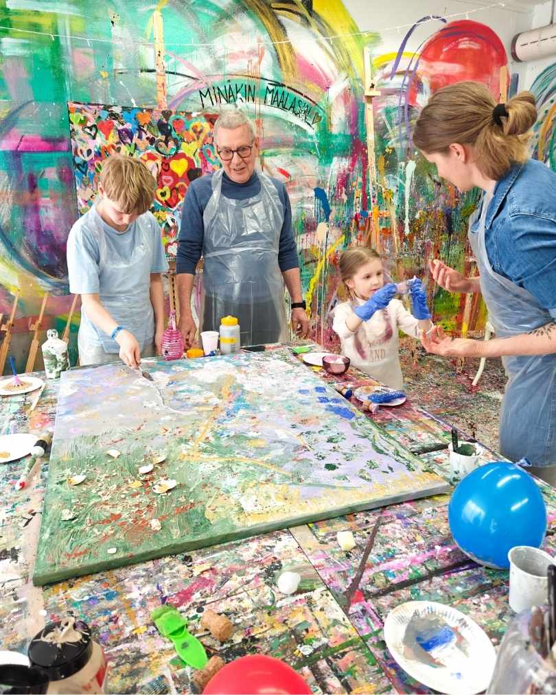 Kahden tunnin ajan maalaatte yhdessä suuren taulun – kahdestaan tai koko perheen voimin. Ette tarvitse kokemusta. Riittää, että tulette.