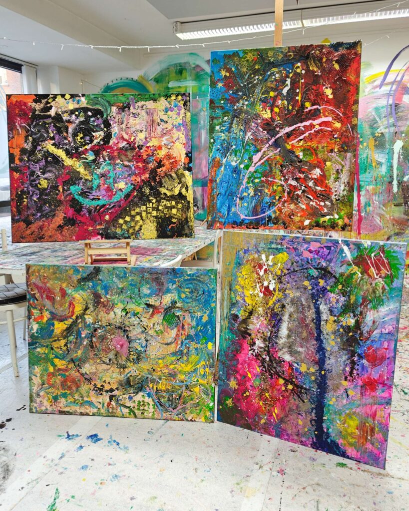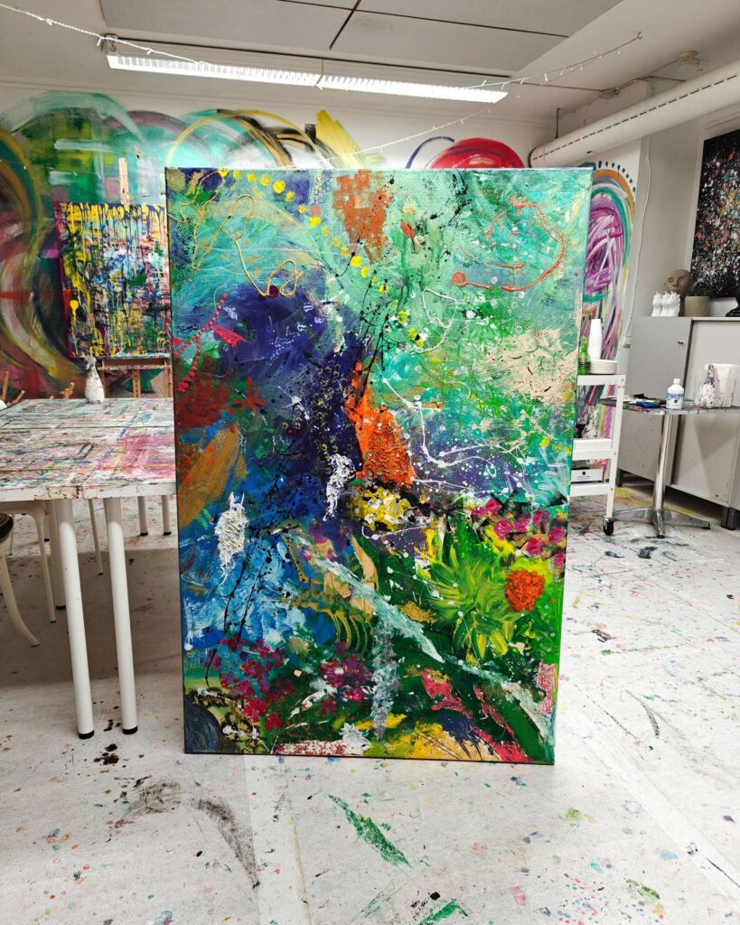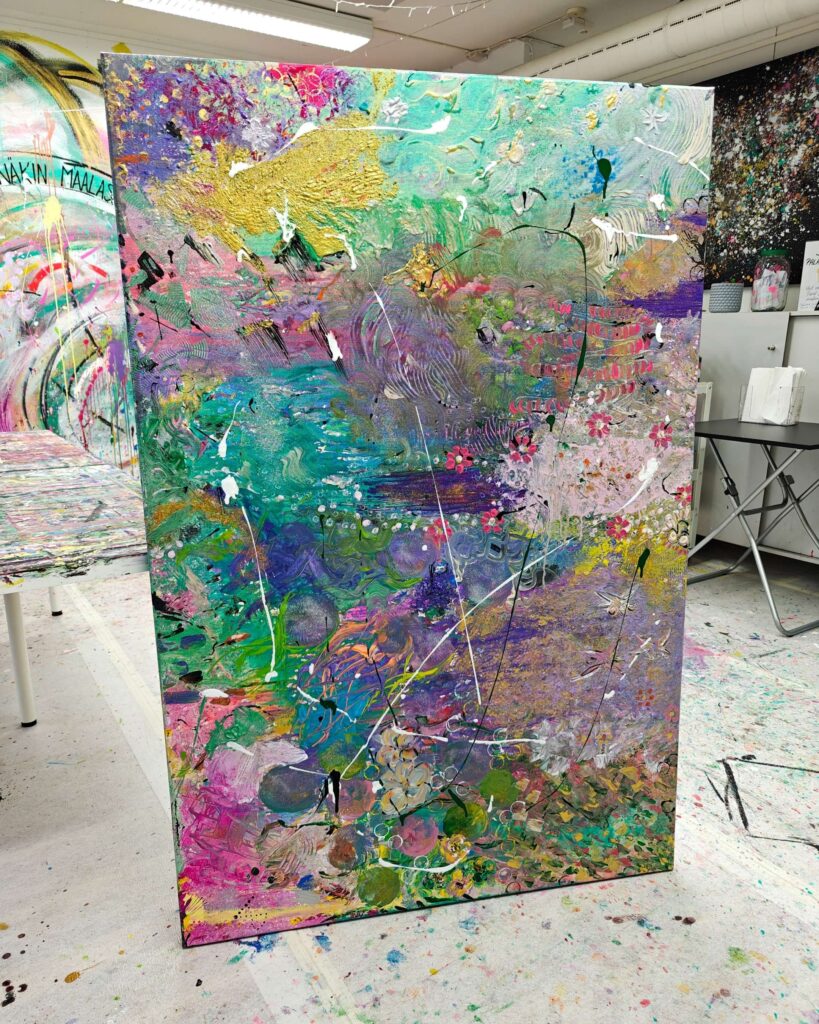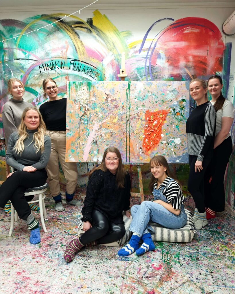 Sitten porukka sukeltaa taulun ääreen. Joku maalaa, toinen lisää tekstuuria, kolmas räiskyttää, neljäs ihastelee ja jatkaa siitä, mihin toinen jäi. Ja jossain vaiheessa joku sanoo sen lauseen, joka kuuluu joka kerta: “Ei vitsi… tästähän tulee ihan mahtava!”