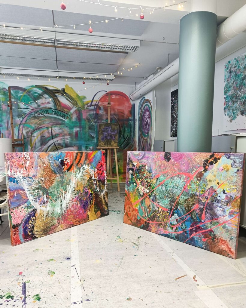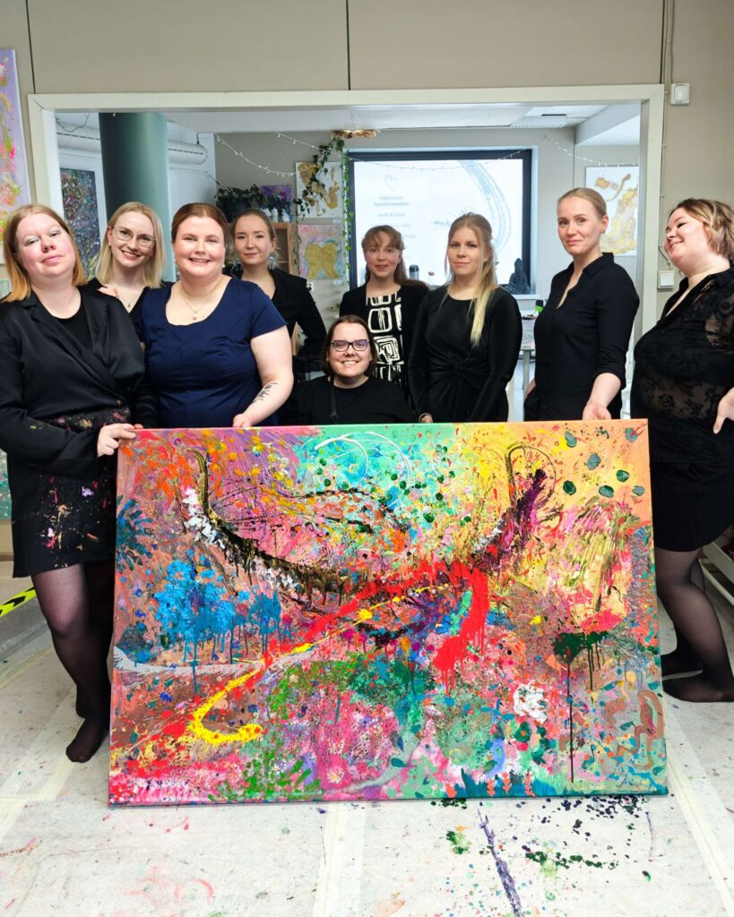 Näitä tauluja on maalattu syntymäpäiväsankarin seinälle, polttarisankarille muistoksi ja työyhteisöjen omiin tiloihin. Yhdessä syntyy jotain, joka muistuttaa tästä päivästä vielä pitkään. Täällä ei pönötetä eikä yritetä tehdä oikein. Me maalaamme intuitiivisesti, yhdessä, niin että jokainen saa olla osa jotain suurempaa.