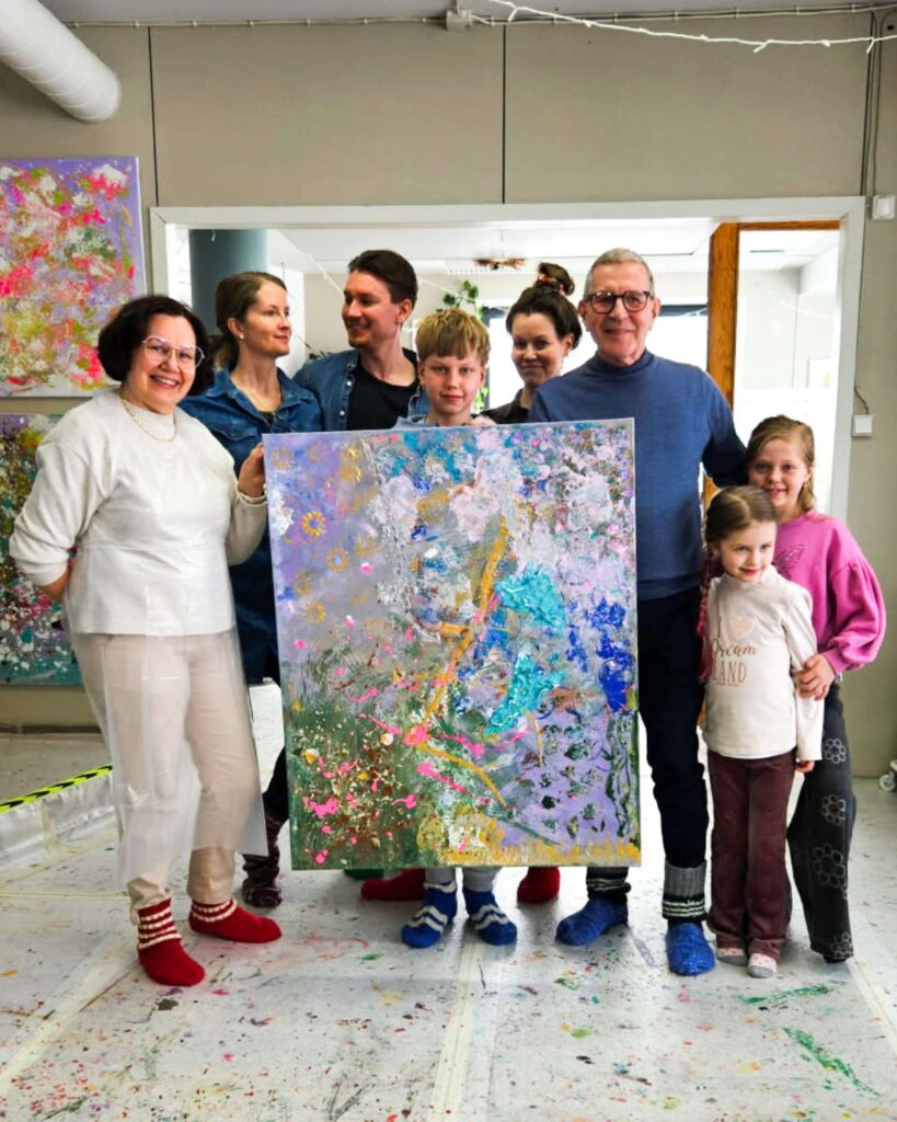 koko porukka saman ison taulun äärellä, naurua, värejä, roiskeita ja käsiä, jotka liikkuvat yhdessä. Ei suorittamista, ei pönötystä – vain yhteistä luovaa hulluttelua.